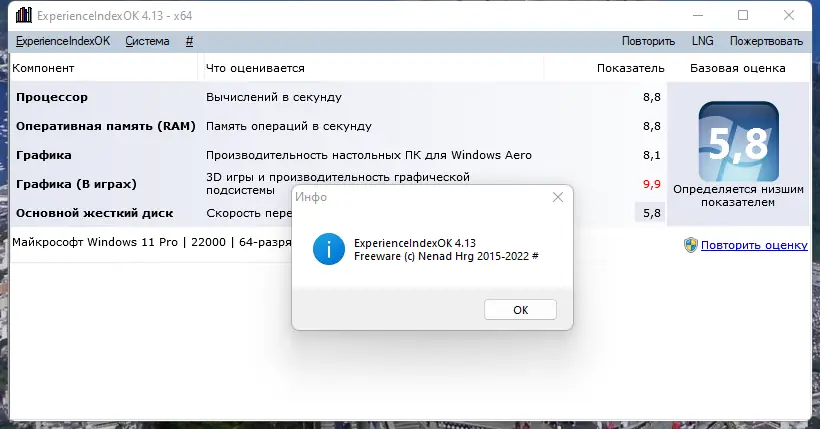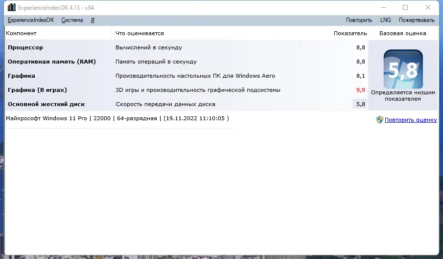 ExperienceIndexOK — это легковесная портативная утилита для анализа производительности компьютера в системах Windows 8.1, 10 и 11, где стандартный индекс производительности недоступен. Программа позволяет быстро оценить основные компоненты системы: процессор, память, дисковую подсистему, графику и производительность интерфейса. Она не требует установки и сразу после запуска начинает сбор данных.