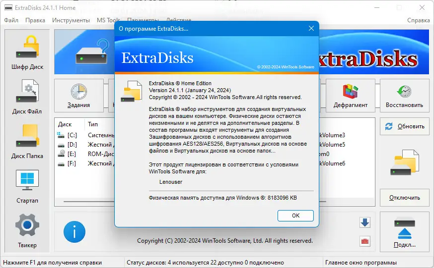 ExtraDisks — это мощный набор инструментов для управления виртуальными дисками и системными настройками. Программа позволяет создавать зашифрованные и файловые диски без изменения структуры реальных разделов, а также оптимизировать автозагрузку и параметры операционной системы. Поддержка шифрования, гибкая настройка и простота использования делают решение полезным для повседневной работы.