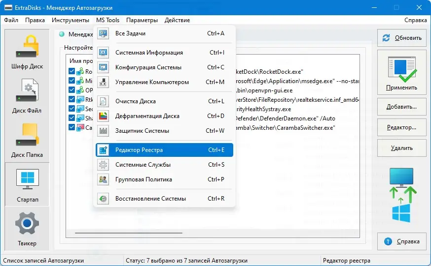 - Управление элементами автозагрузки системы