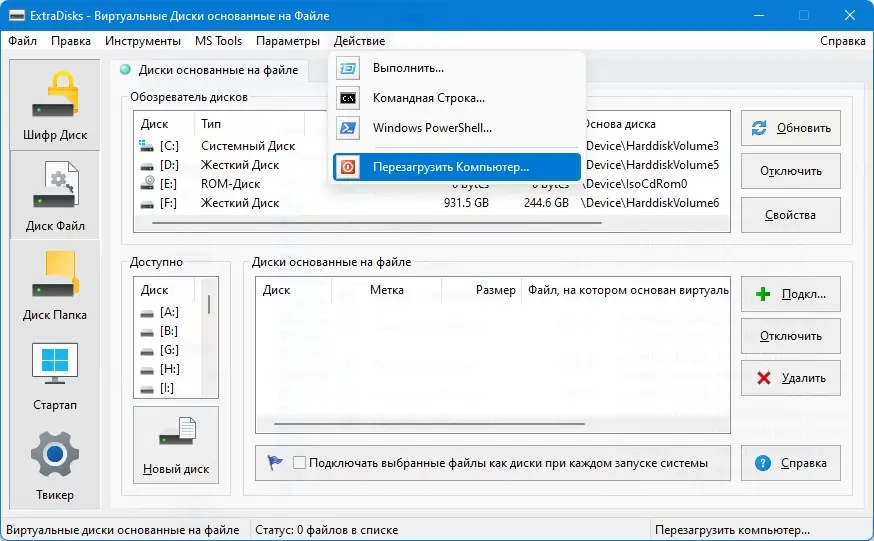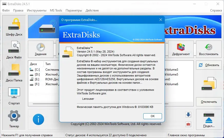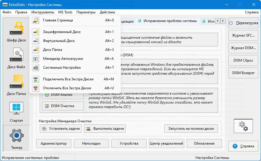 ExtraDisks — это набор системных утилит для создания виртуальных дисков на основе файлов, папок и шифрования данных. Программа позволяет организовать защищённое хранение информации, управлять автозагрузкой и настраивать параметры операционной системы без изменения структуры физических носителей.