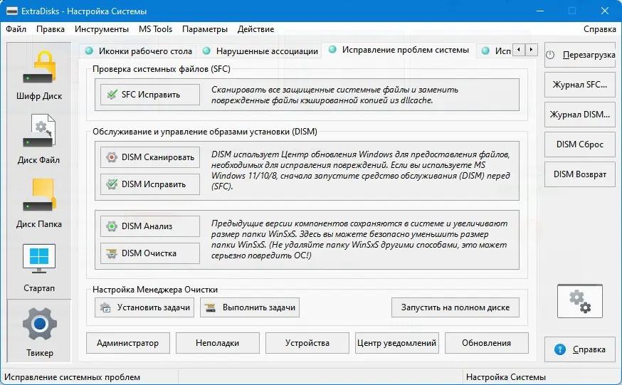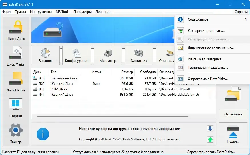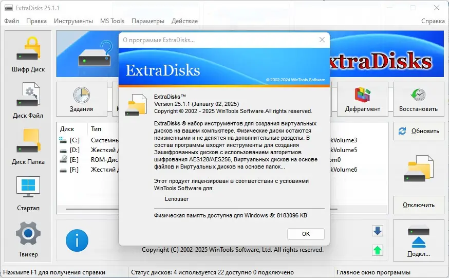 ExtraDisks — это набор системных инструментов для создания и управления виртуальными дисками, шифрования данных и настройки параметров операционной системы. Программа позволяет организовать безопасное хранение информации, оптимизировать автозагрузку и расширить функциональность Windows без вмешательства в структуру физических носителей. Решение подходит как для домашнего использования, так и для профессиональных задач, требующих повышенной конфиденциальности и контроля над системой.
