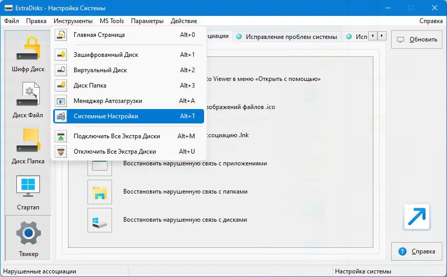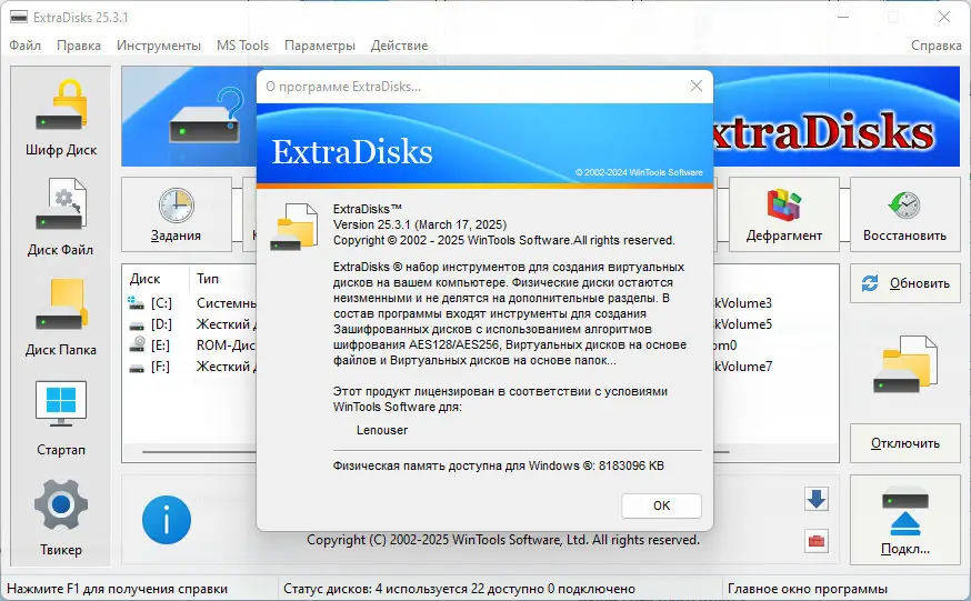 ExtraDisks — это набор системных инструментов для создания и управления виртуальными дисками, настройки автозагрузки и оптимизации параметров операционной системы. Программа позволяет работать с зашифрованными, файловыми и каталоговыми дисками, не изменяя физическую структуру жёсткого диска. Поддерживается работа с различными режимами шифрования, управление автозагрузкой и расширенные настройки системы.
