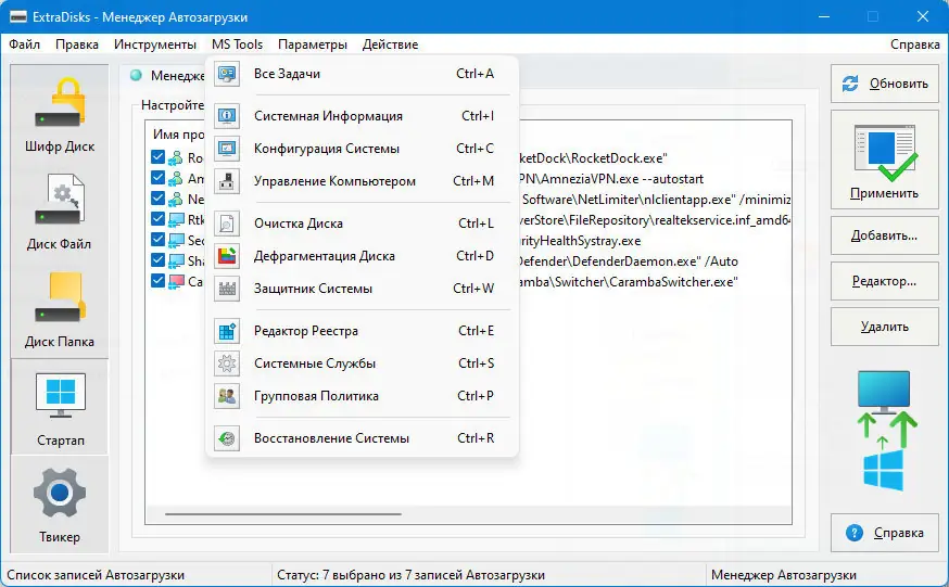 - Управление элементами автозагрузки через встроенный диспетчер