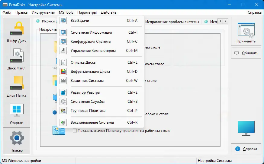 Работа с ExtraDisks интуитивно понятна благодаря логичной структуре интерфейса. Для создания зашифрованного диска выбирается соответствующий инструмент, указывается размер и путь сохранения, после чего задаётся пароль. Виртуальный диск на основе файла создаётся аналогично, с тем отличием, что шифрование может быть отключено. Диск на основе папки монтируется напрямую, превращая выбранную директорию в отдельный логический диск. Менеджер запуска отображает все приложения, запускаемые при старте системы, с возможностью включения, отключения или удаления записей. Системные настройки изменяются через модуль «Настройка системы», где собраны параметры безопасности, файловой подсистемы и области уведомлений. Все операции выполняются без перезагрузки, за исключением некоторых изменений реестра.
