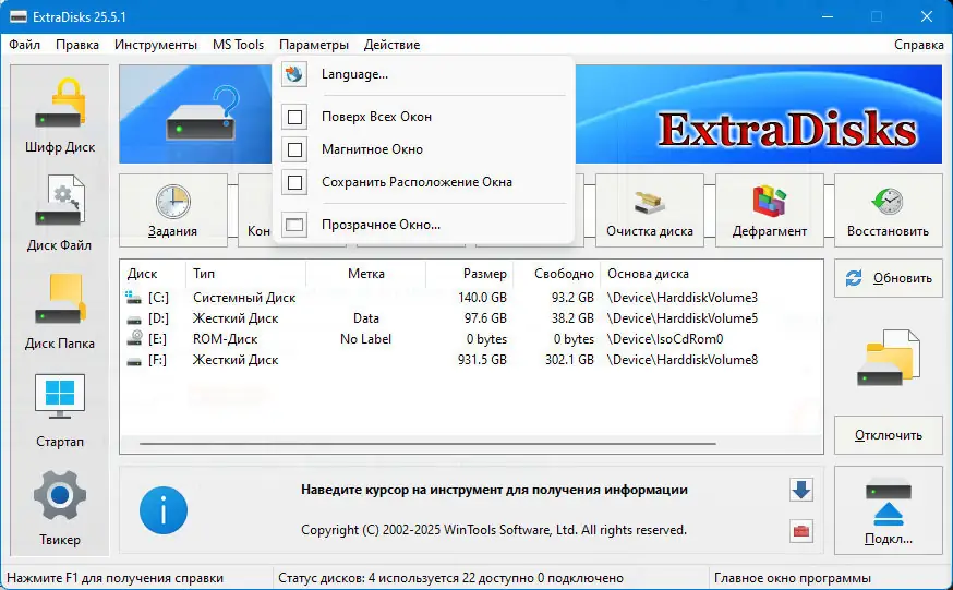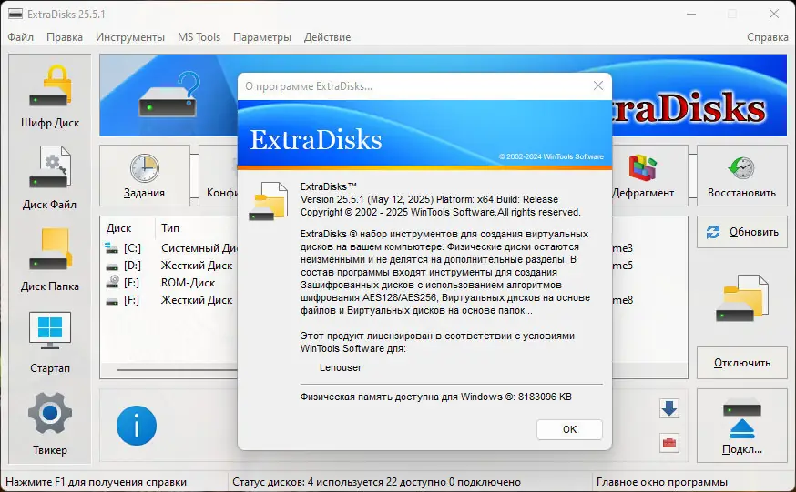 ExtraDisks — это комплекс утилит для создания и управления виртуальными дисками, шифрования данных и настройки автозагрузки, работающий без изменения структуры физических носителей. Программа позволяет организовать защищённое хранение информации, оптимизировать доступ к папкам и контролировать системные процессы на уровне операционной системы. Решение подходит для пользователей, которым важны безопасность, гибкость и стабильность работы с дисками и системными настройками.