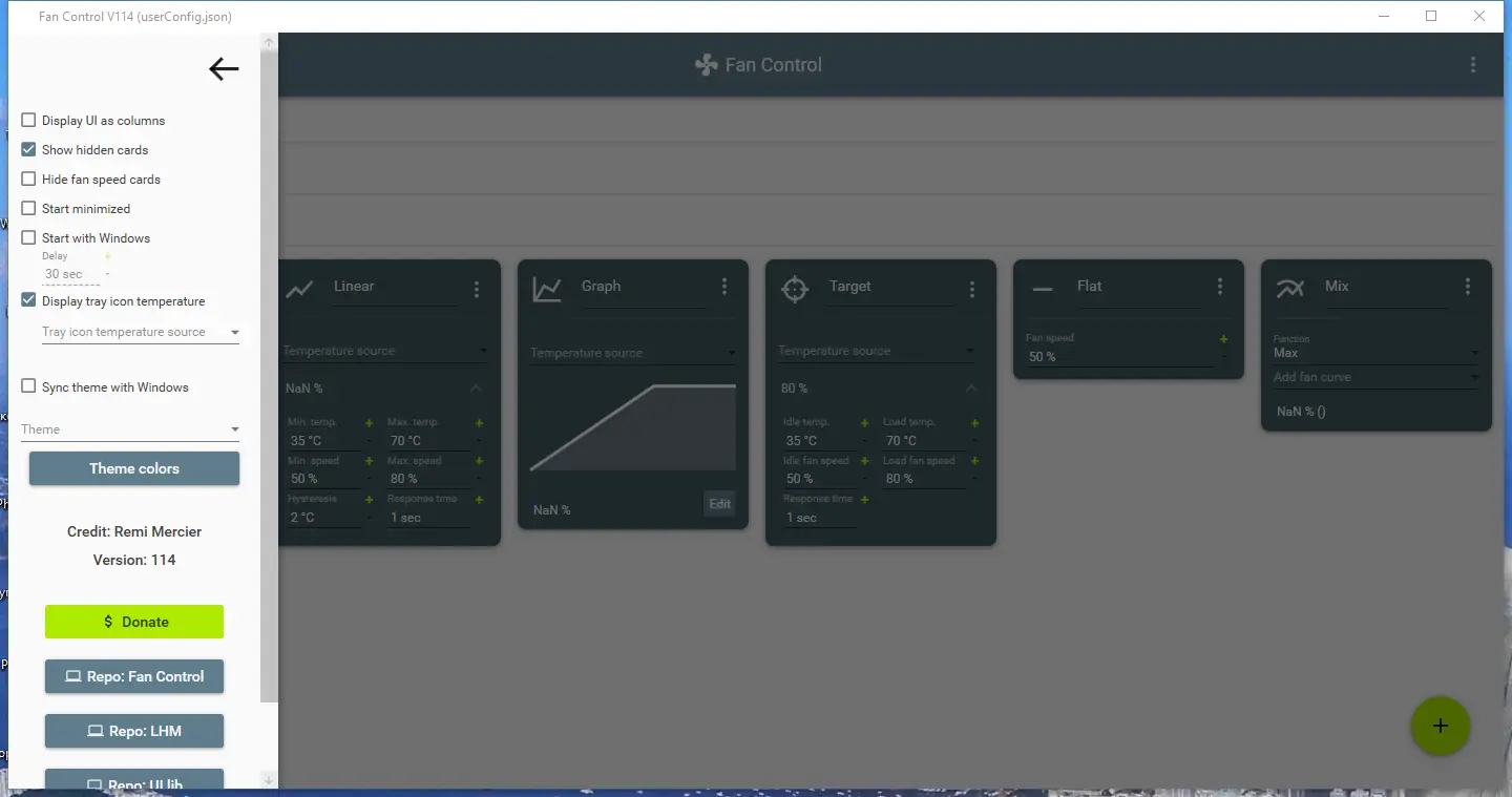 После запуска FanControl пользователь проходит через мастер настройки, который автоматически определяет доступные датчики температуры и подключённые вентиляторы. На основе этих данных можно создавать температурные кривые — зависимости скорости вращения кулера от показаний датчика. Например, при повышении температуры процессора вентилятор будет постепенно увеличивать обороты. Поддержка нескольких профилей позволяет быстро переключаться между режимами — тихим для повседневных задач и агрессивным при нагрузке. Программа работает в трее, не занимая лишнего места на панели задач, и позволяет в любой момент открыть настройки. Также доступны цветовые темы интерфейса, что улучшает визуальное восприятие.