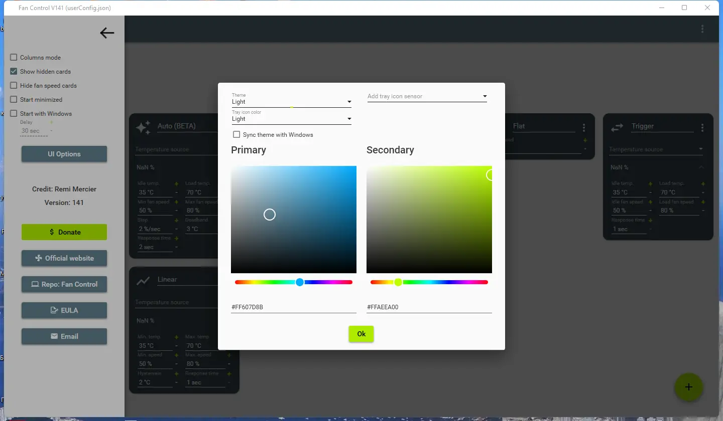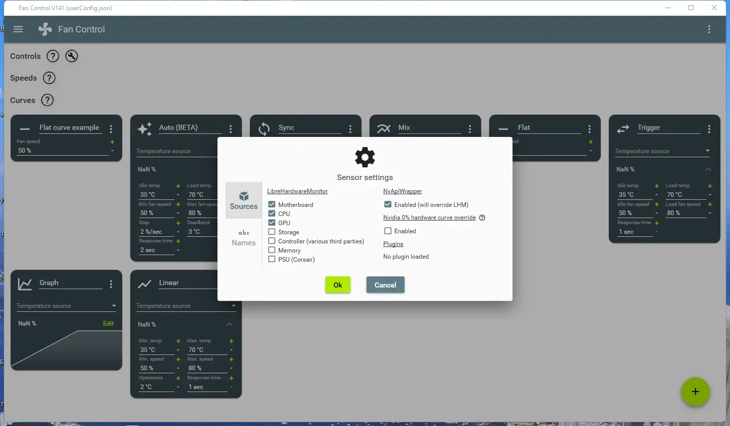 После запуска FanControl пользователь может воспользоваться встроенным мастером настройки, который автоматически определит доступные датчики температуры и скорости вращения. Далее создаётся профиль, в котором задаётся зависимость оборотов кулера от показаний выбранного датчика — так называемая вентиляторная кривая. Можно настроить несколько профилей, например, «тихий режим» для повседневных задач и «максимальное охлаждение» для игр или рендеринга. Программа поддерживает добавление пользовательских датчиков через файлы с расширением *.sensor, что расширяет её функционал. После настройки приложение продолжает работать в трее, отображая текущие показатели и позволяя быстро менять режим.
