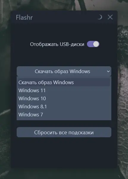 Использование Flashr не требует специальных навыков. После запуска приложение предлагает выбрать, какой образ Windows нужен — пользователь может начать загрузку напрямую из интерфейса. Затем программа предложит указать целевой USB-накопитель и автоматически выполнит форматирование, запись и пост-обработку. По завершении процесса появится уведомление о готовности установочной флешки. Интерфейс поддерживает смену темы, а элементы управления оптимизированы под точное нажатие.