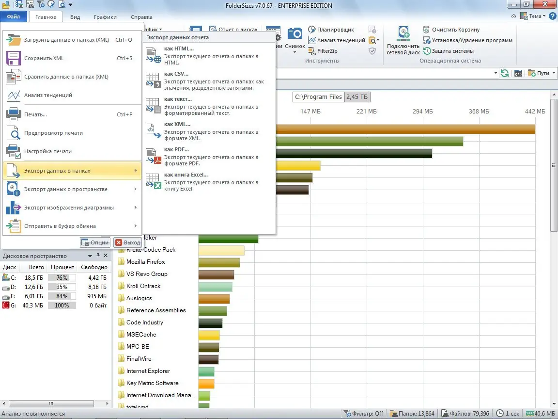 FolderSizes отличается высокой функциональностью и гибкостью в работе с данными. Программа поддерживает анализ не только локальных, но и сетевых дисков, отображая информацию о свободном и общем пространстве. Возможность экспорта отчётов в HTML и Excel расширяет сценарии её использования — от личного контроля до корпоративного аудита. При этом интерфейс остаётся интуитивно понятным, а скорость работы — на высоком уровне.