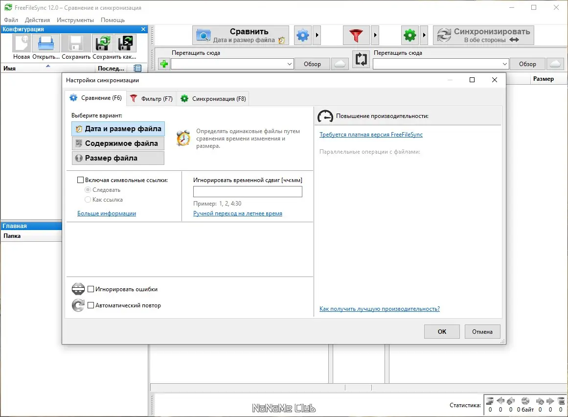 - Программа позволяет сравнивать файлы не только по дате и размеру, но и по содержимому, что гарантирует точность синхронизации.