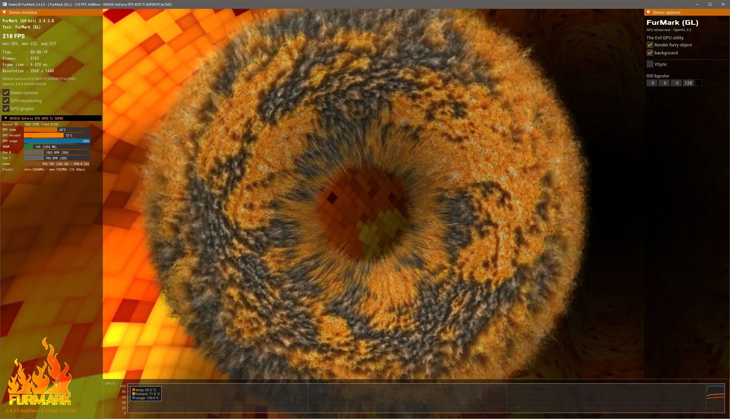 FurMark 2 — это обновлённая версия известной утилиты для тестирования графических процессоров, разработанная на базе движка GeeXLab. Программа создаёт экстремальную нагрузку на GPU, что делает её идеальным решением для выявления термальных и частотных утечек при разгоне. Она поддерживает современные API, включая OpenGL и Vulkan, обеспечивая корректную работу с большинством современных видеокарт. Благодаря возможности настройки разрешения, режима отображения и параметров сглаживания, тест можно адаптировать под конкретную конфигурацию. Также реализовано точное измерение температуры, использования видеопамяти и частоты ядра в реальном времени.