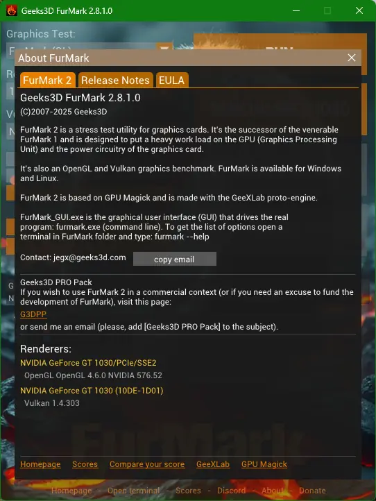FurMark 2 — это мощная утилита для стресс теста видеокарт, предназначенная для проверки стабильности и термальной нагрузки графических процессоров. Программа поддерживает современные API, включая OpenGL и Vulkan, и подходит как для оверклокеров, так и для обычных пользователей, желающих протестировать систему. Инструмент позволяет оценить производительность GPU в экстремальных условиях и выявить возможные проблемы с охлаждением или питанием.