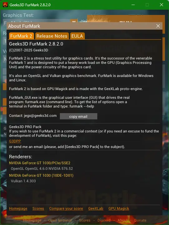 Программа создана на базе движка GeeXLab, что обеспечивает высокую стабильность и точность тестирования