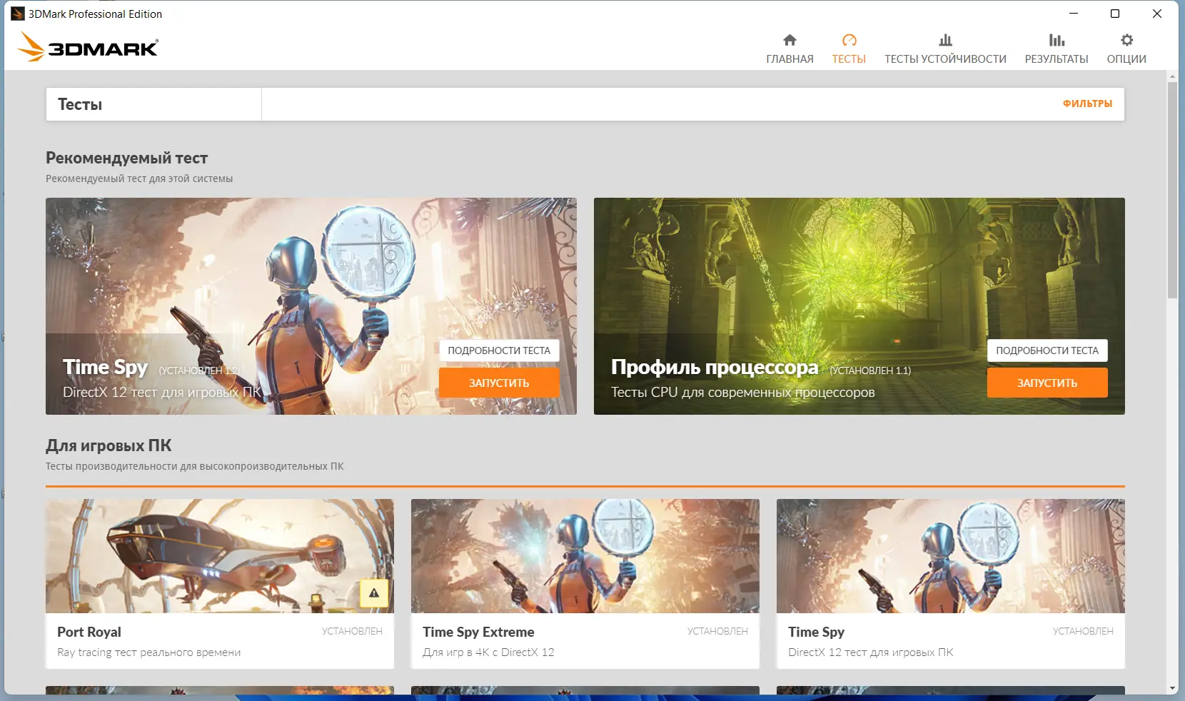 - Широкий выбор тестов для разных типов устройств — от смартфонов до игровых ПК