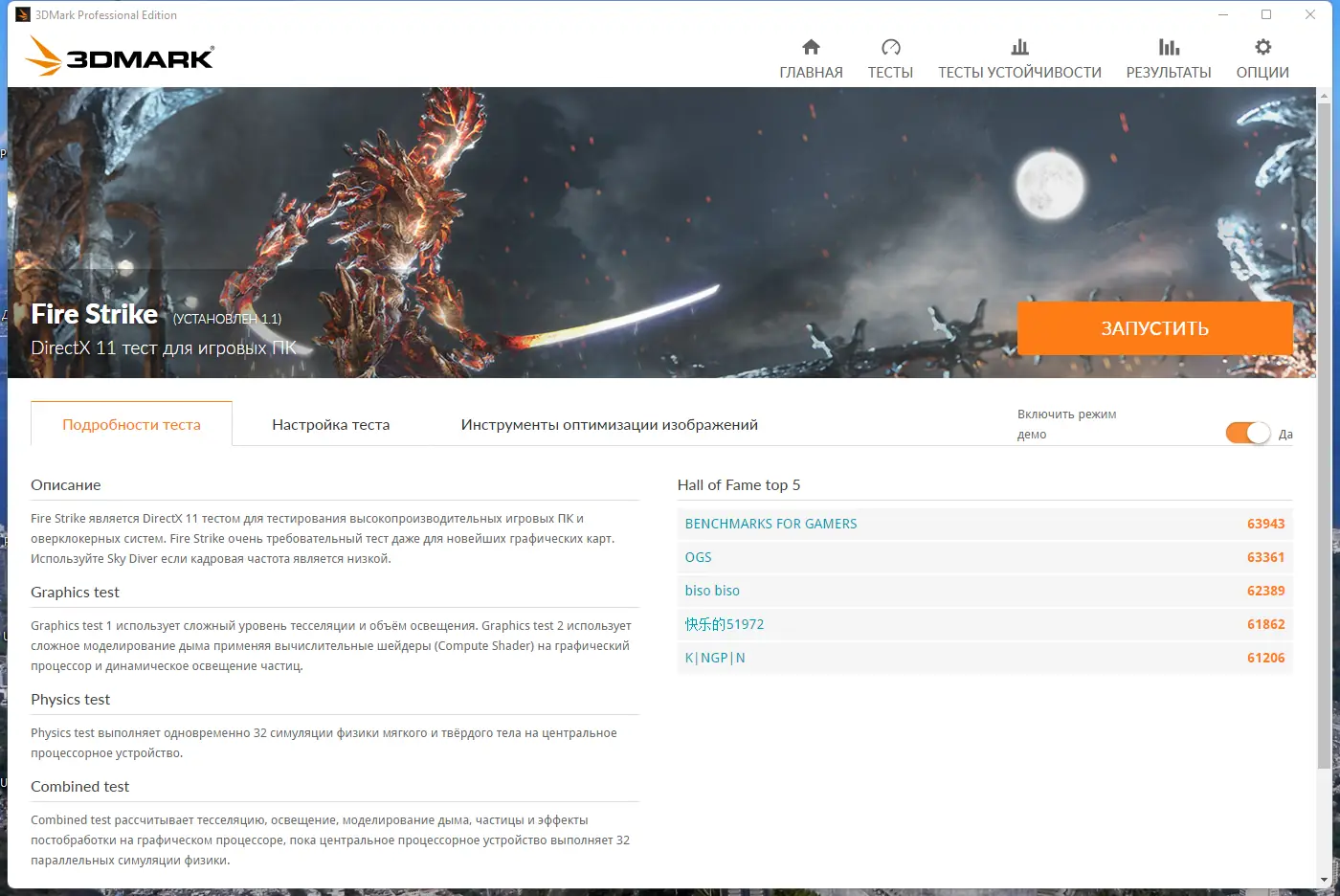 - В состав входят специализированные пакеты, такие как Time Spy для DirectX 12 и Fire Strike для систем с поддержкой DirectX 11.