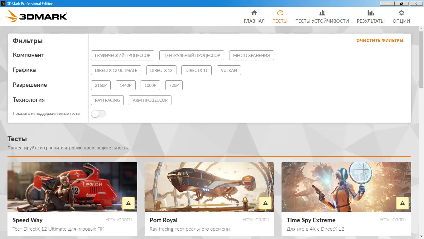 Платформа Futuremark сочетает в себе высокую точность измерений и удобный интерфейс, что делает её незаменимой для тестирования игровых систем. Каждый тест оптимизирован под конкретный класс устройств — от бюджетных планшетов до топовых ПК с несколькими видеокартами. Программа поддерживает такие режимы, как Time Spy для DirectX 12, Fire Strike для DirectX 11 и Cloud Gate для офисных и домашних компьютеров. Также доступны специализированные тесты для мобильных устройств, включая Ice Storm и его расширенные версии.