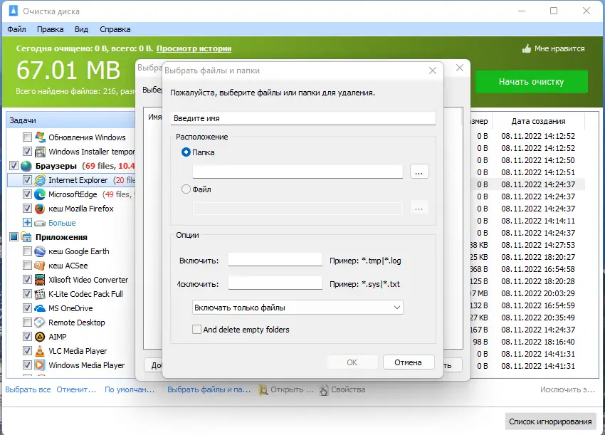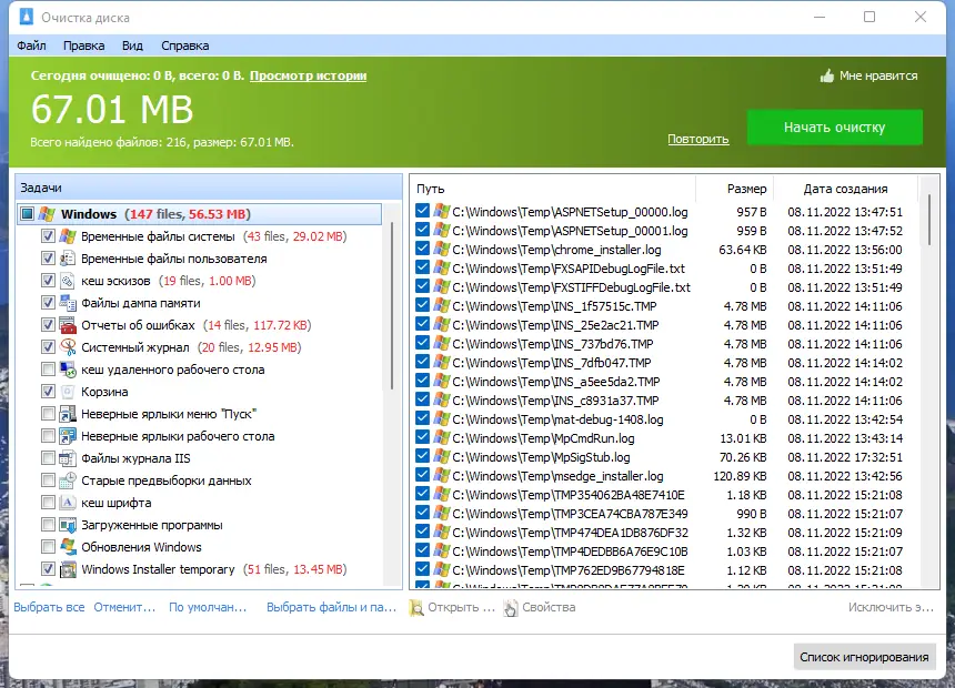 - Удаление файлов дампа, отчётов об ошибках и системных журналов
