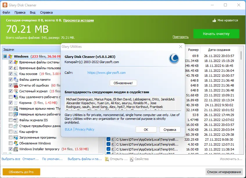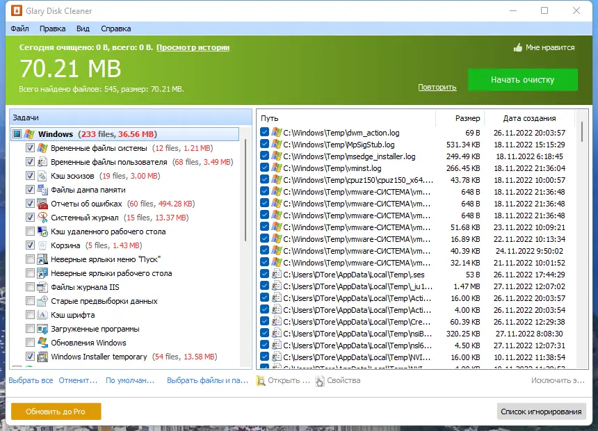 Glary Disk Cleaner — это бесплатная утилита для глубокой очистки системы от временных файлов, кэша, дампов памяти и других видов ненужных данных. Программа помогает освободить дисковое пространство, ускорить работу компьютера и поддерживать систему в порядке без лишних усилий.