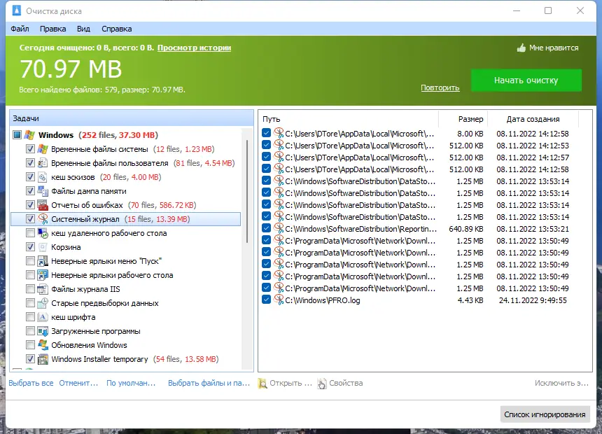 - Устранение файлов дампа памяти и системных журналов, занимающих значительный объём
