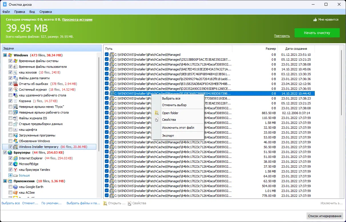 - Удаление временных файлов системы и пользователя, включая данные установщика Windows и обновлений