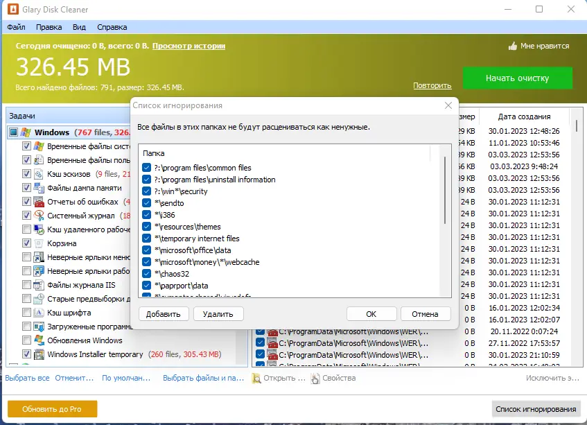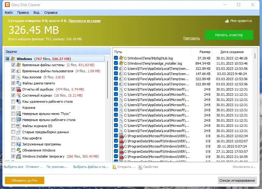 - Автоматическое обнаружение временных файлов системы и приложений