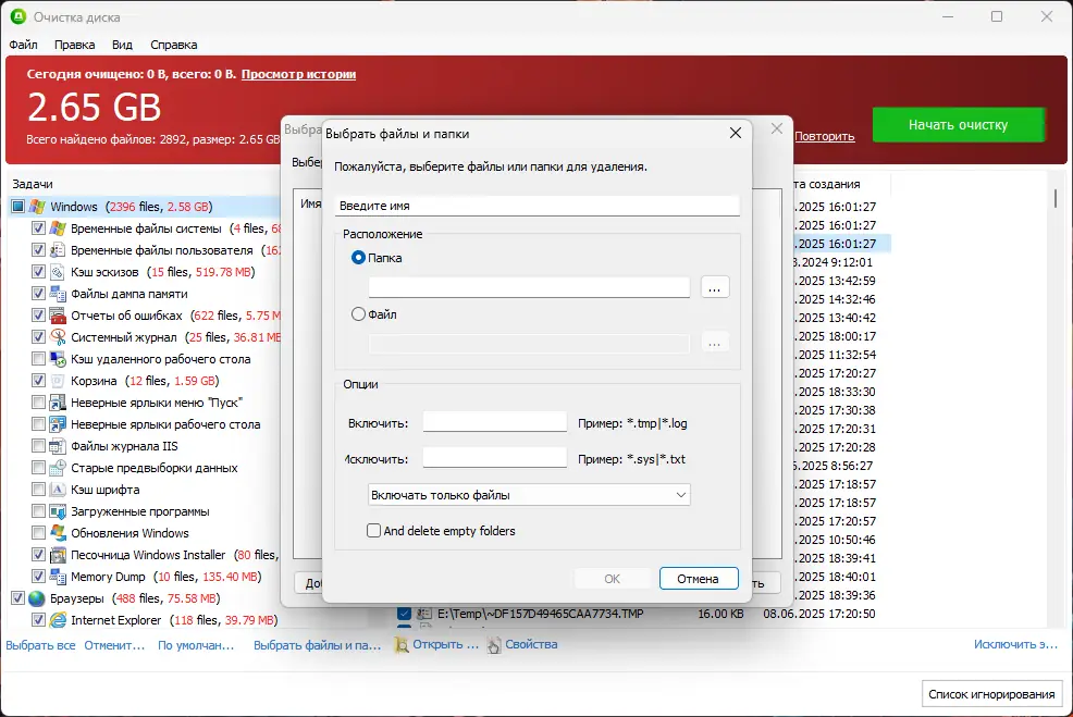 - Удаление временных файлов системы и пользователей, включая кэш установщика Windows и обновлений