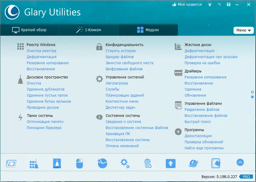 - Широкий набор встроенных утилит, охватывающих все аспекты системной оптимизации.