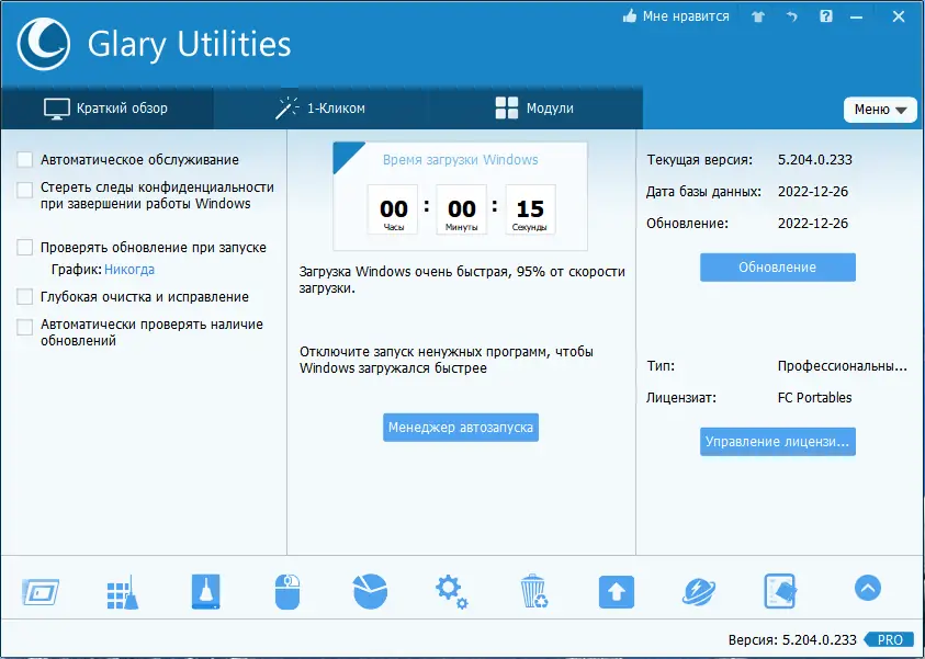 Glary Utilities — это мощный пакет системных утилит для комплексной оптимизации и обслуживания компьютера. Программа помогает очистить систему от мусора, исправить ошибки реестра, управлять автозагрузкой и повысить производительность ПК. С её помощью можно быстро найти и устранить проблемы, влияющие на стабильность и скорость работы операционной системы. Инструмент подходит как для новичков, так и для опытных пользователей, стремящихся поддерживать систему в идеальном состоянии.