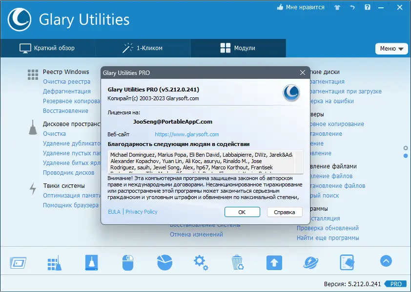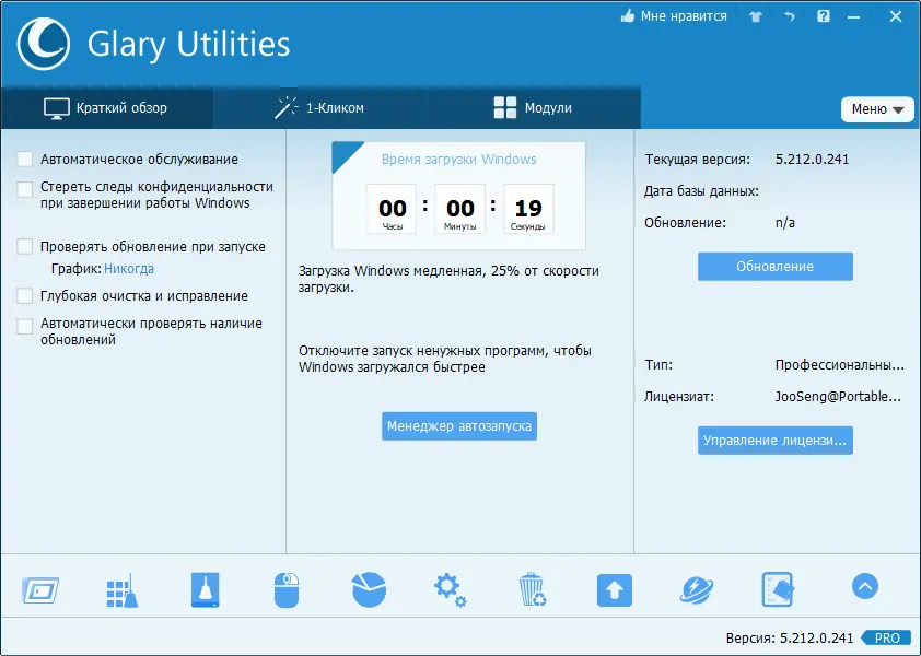 Glary Utilities — это многофункциональный инструмент для оптимизации и настройки операционной системы, который помогает ускорить работу компьютера, очистить реестр, освободить место на диске и управлять запускаемыми приложениями. Программа объединяет десятки полезных утилит в едином интерфейсе, обеспечивая комплексный подход к обслуживанию ПК.