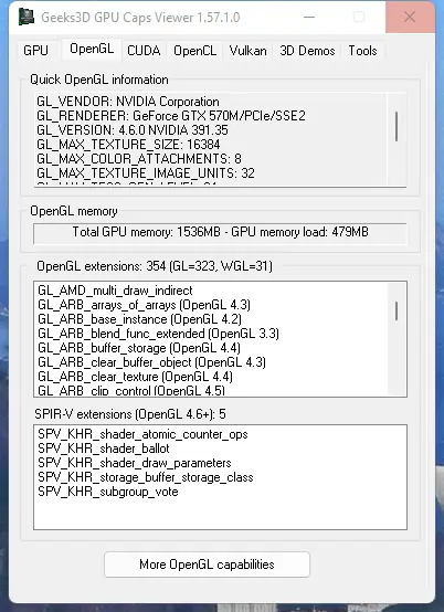 - Отображение спецификаций OpenGL, включая поддерживаемые версии, размеры текстур и количество текстурных блоков.