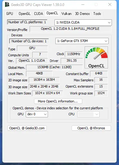 - Просмотр списка доступных и активных OpenCL API с указанием поддерживаемых функций для каждой видеокарты.