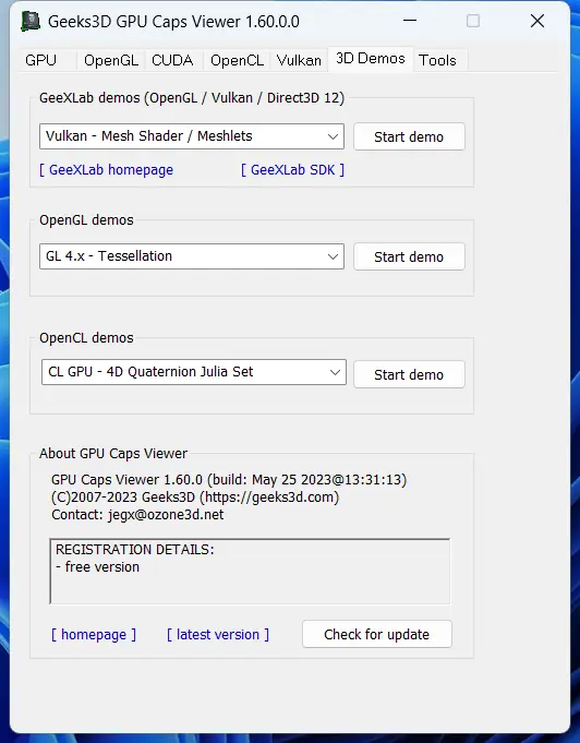 Программа доступна в последней версии 1.60.0.0 с поддержкой новых видеокарт, включая NVIDIA GeForce RTX 4060 Ti и AMD Radeon RX 7600. Обновление включает улучшения в работе демонстрационных окон, а также обновленные версии компонентов GPU Shark, ZoomGPU и библиотек GeeXLab. Портативная сборка распространяется в сжатом архиве с контрольными суммами для проверки целостности. Проект тесно связан с ресурсом geeks3d, где публикуются новости и обновления разработчика. Чтобы использовать все функции, достаточно скачать архив, распаковать и запустить исполняемый файл.
