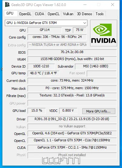 - Отображает полную информацию о графических картах, включая модель, объём памяти, версию BIOS и текущие настройки драйвера.