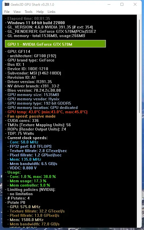 - Отображает тактовые частоты ядра, памяти и шейдерных блоков.