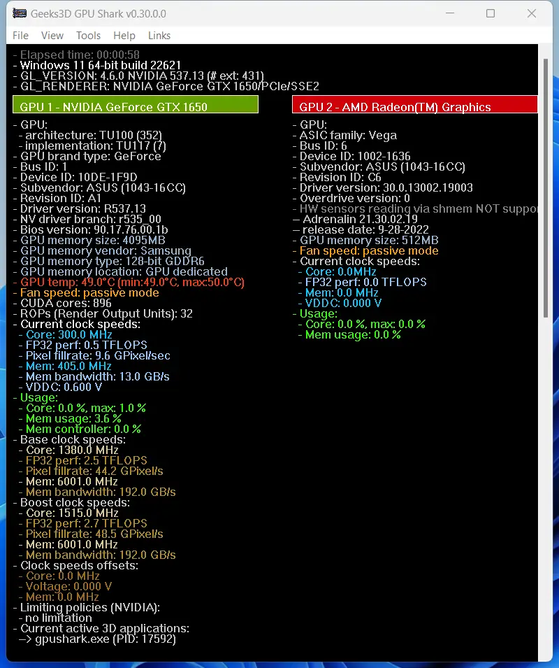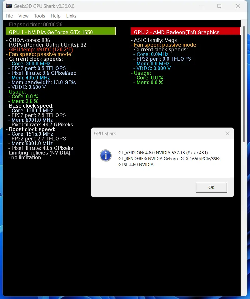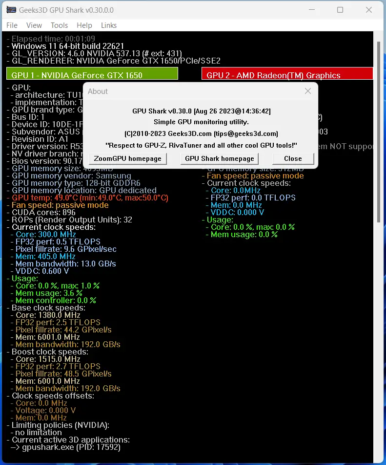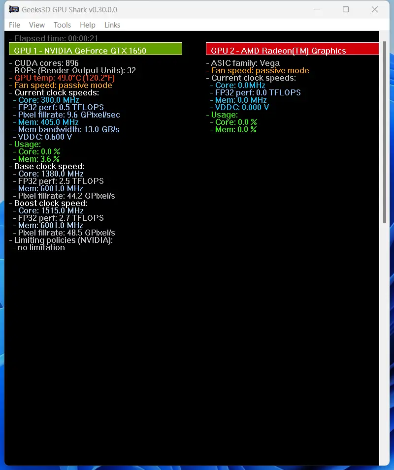 GPU Shark — компактная бесплатная утилита для мониторинга видеокарт, отображающая ключевые параметры графического процессора в реальном времени. Поддерживает видеокарты на базе чипсетов NVIDIA GeForce и AMD Radeon, предоставляя данные о температуре, загрузке, частотах и состоянии системы охлаждения.