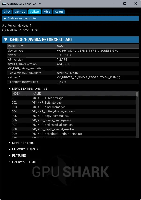 Запуск GPU Shark не требует установки — достаточно распаковать архив и запустить исполняемый файл. После старта программа автоматически определяет все подключённые графические процессоры и начинает сбор данных. Пользователь может переключаться между вкладками, чтобы получить сведения о текущем состоянии датчиков, поддержке API, а также скопировать информацию для отчёта. В разделе Misc доступна функция экспорта данных в текстовый файл, что удобно при диагностике или сравнении конфигураций. В будущем планируется добавление вкладок для OpenCL и CUDA, что расширит аналитические возможности утилиты.