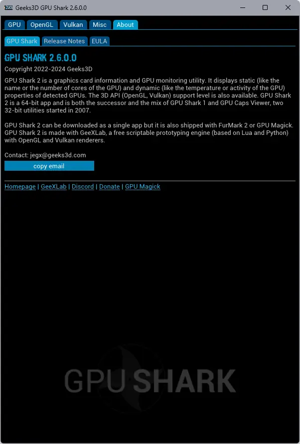 GPU Shark 2 разработана как обновлённая версия предыдущего поколения и предлагает расширенные возможности мониторинга графических адаптеров. Утилита построена на основе движка прототипирования GeeXLab, что обеспечивает высокую стабильность и совместимость с современным оборудованием. Она поддерживает широкий спектр видеокарт, включая модели от NVIDIA GeForce, AMD Radeon и Intel Arc, что делает её универсальным решением для пользователей с разными конфигурациями.