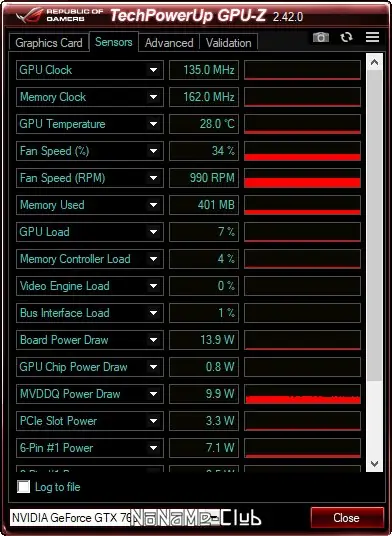 - Считывает данные с датчиков: температура GPU, частота ядра и памяти, обороты вентилятора.