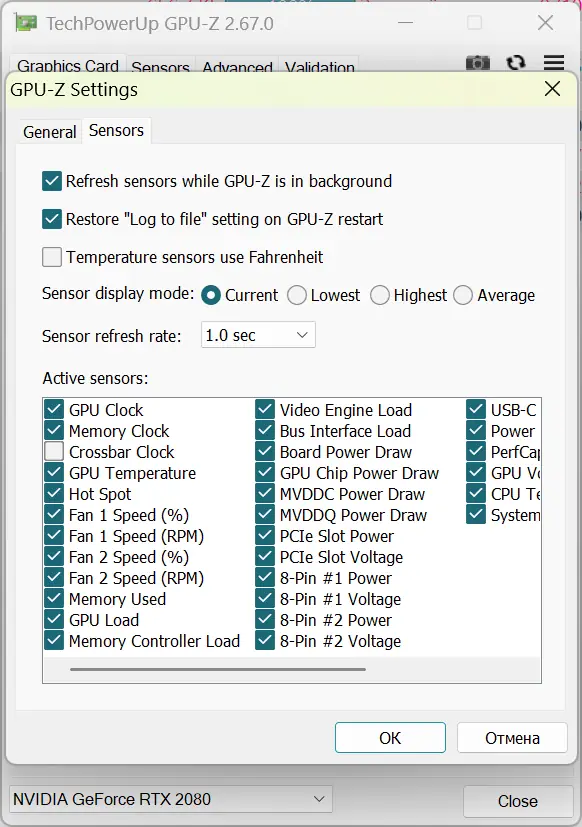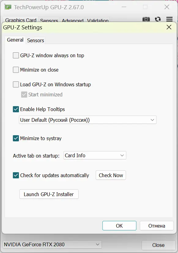 Интерфейс GPU-Z интуитивно понятен и разделён на несколько вкладок: Graphics Card, GPU, Display, Sensors и Advanced. На вкладке Graphics Card отображаются основные сведения: модель адаптера, производитель, версия BIOS, объём и тип видеопамяти, ширина шины. Вкладка GPU показывает архитектуру чипа, техпроцесс, количество вычислительных блоков, а также поддерживаемые API, такие как DirectX, Vulkan и OpenGL. Вкладка Sensors — одна из самых полезных, так как в ней в реальном времени отображаются температура GPU, частоты ядра и памяти, загрузка, скорость вращения кулера и напряжение. Данные можно обновлять вручную или настроить автоматическое обновление. Также доступна функция сохранения скриншотов с водяным знаком TechPowerUp, что удобно для демонстрации конфигурации системы. В настройках можно включить автозапуск, выборочный показ датчиков и проверку обновлений.