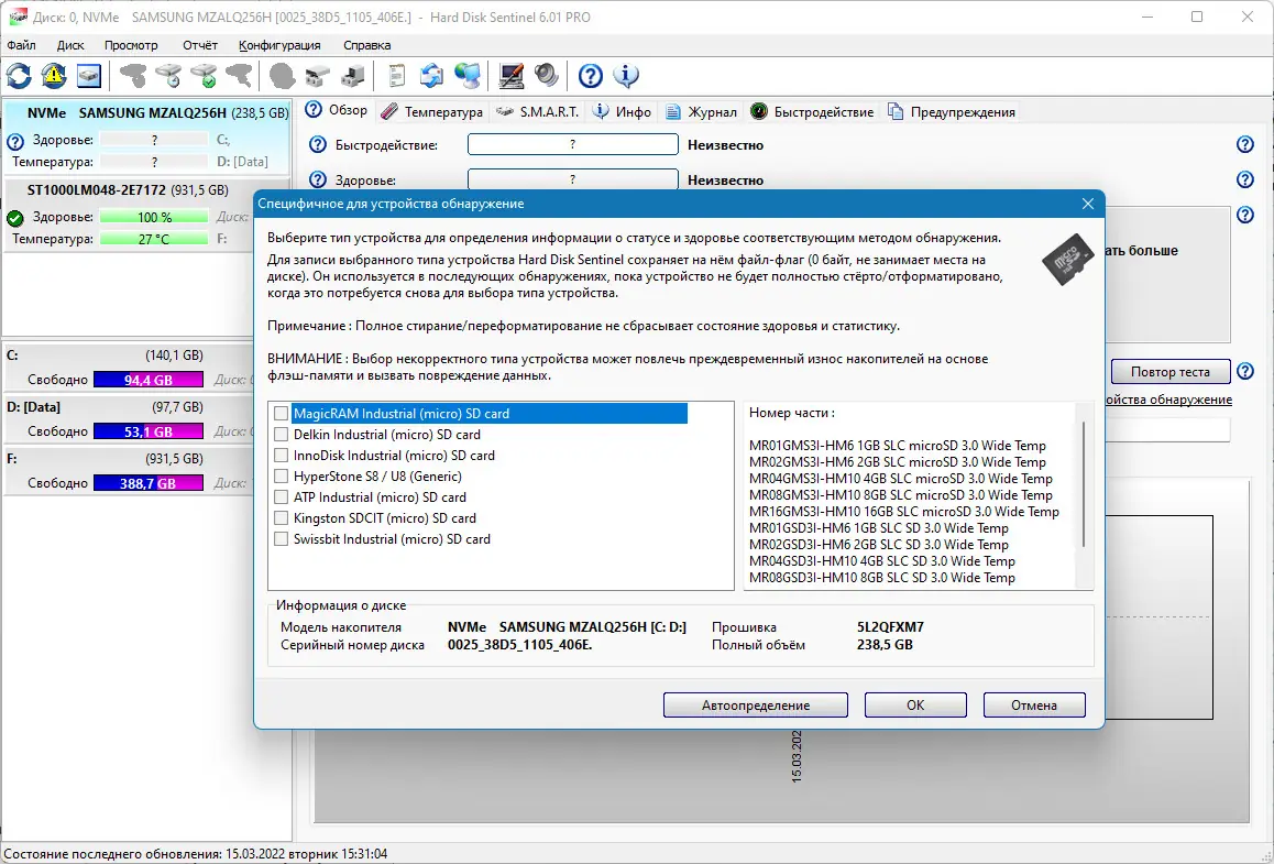 - Точное отображение состояния и температуры всех типов накопителей в реальном времени.