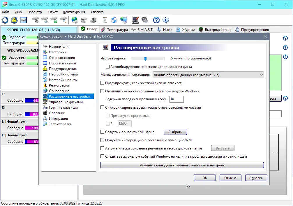 - Интерпретация S.M.A.R.T.-данных в понятный процентный показатель общего состояния диска.