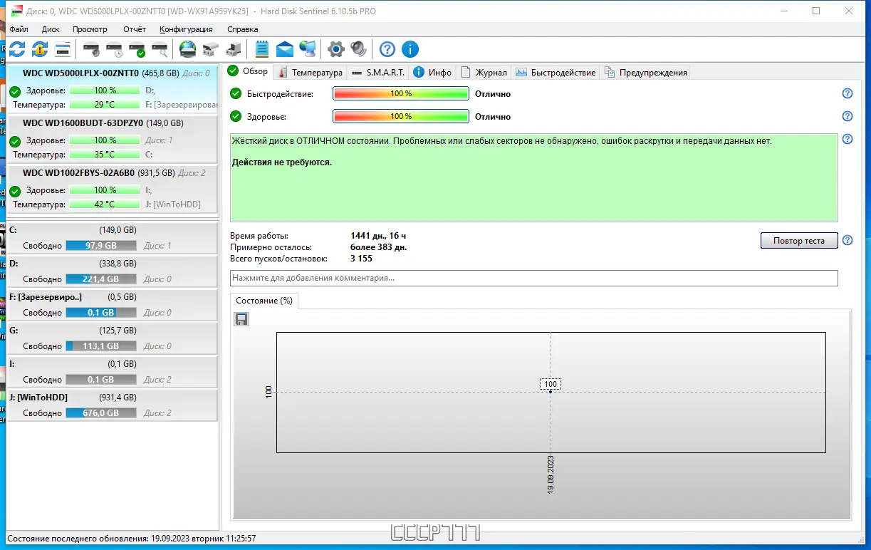 - Оценка состояния дисков в процентах на основе анализа S.M.A.R.T.-параметров.