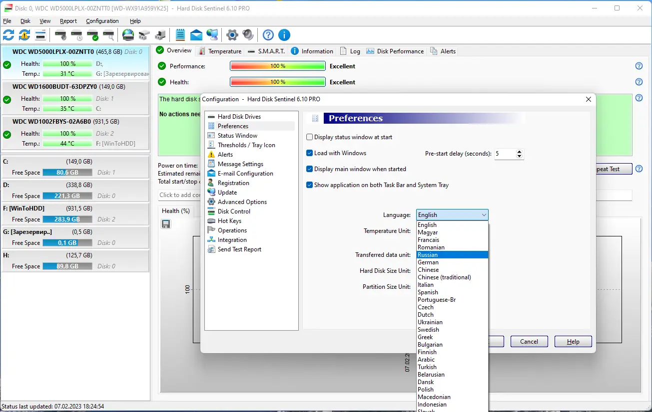После запуска программа автоматически определяет все подключенные накопители и отображает их статус в основном окне. Пользователь может просматривать детализированные параметры каждого диска: модель, объём буфера, ревизию прошивки, режим передачи данных. Для смены языка интерфейса необходимо перейти в меню Configuration → Preferences и выбрать нужный язык в строке Language. Программа поддерживает русский и множество других языков. В настройках доступно управление уведомлениями, планирование тестов, ведение логов и настройка автозапуска. Информация о температуре может выводиться в системную панель, а при её повышении — запускаться предупреждение или даже завершение работы ПК.