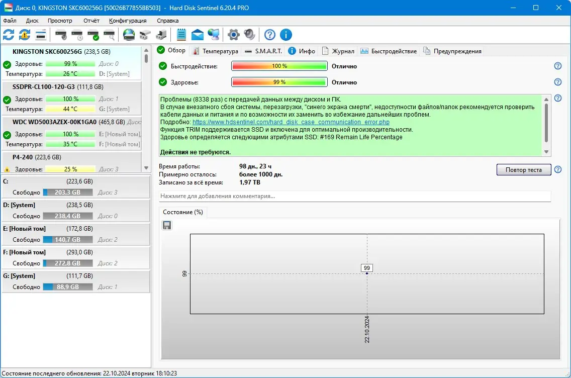 Hard Disk Sentinel — это утилита, предназначенная для диагностики и мониторинга дисковых накопителей в режиме реального времени. Она поддерживает HDD, SSD и другие типы носителей, подключённые через интерфейсы IDE, SATA и SCSI. Основная цель программы — предотвратить внезапный отказ оборудования, вовремя оповестив пользователя о критических изменениях. Это достигается за счёт анализа данных S.M.A.R.T., контроля температуры и оценки производительности передачи данных. Программа работает в фоне, не нагружая систему, и предоставляет детальную информацию о каждом диске, включая модель, объём буфера, ревизию прошивки и режимы передачи.