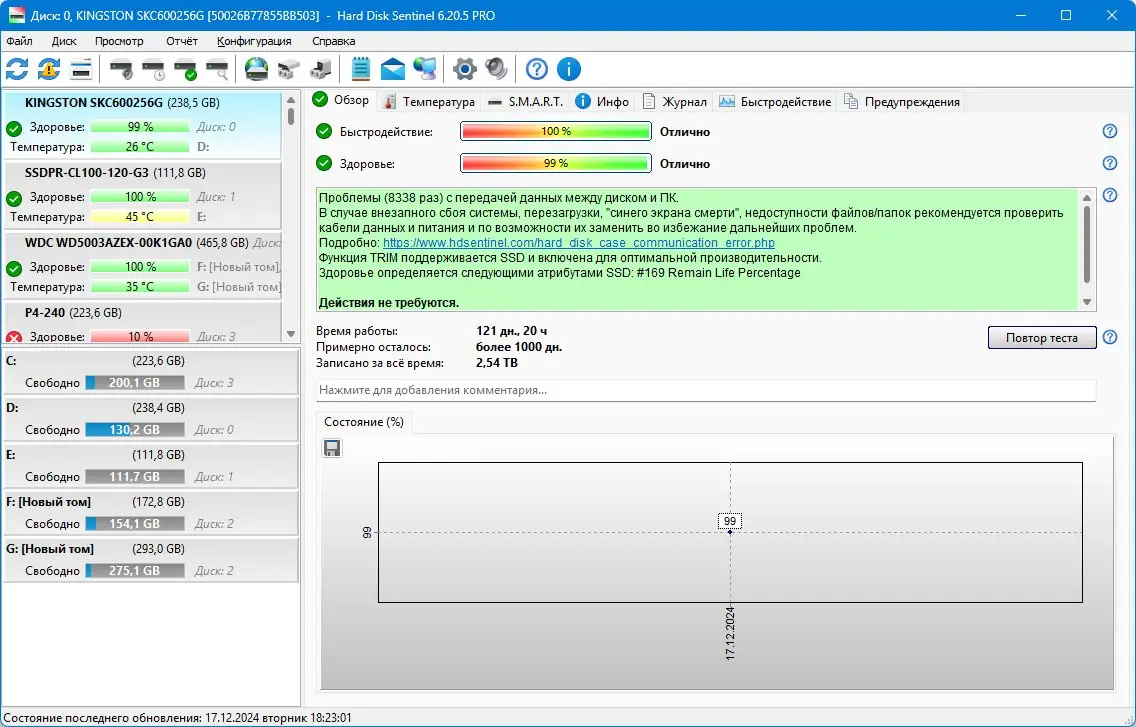 Hard Disk Sentinel — это инструмент для постоянного контроля состояния жёстких дисков и твердотельных накопителей. Программа анализирует параметры S.M.A.R.T., температуру, производительность и предупреждает о потенциальных сбоях до их наступления. Это позволяет сохранить ценные данные и избежать дорогостоящего восстановления информации.