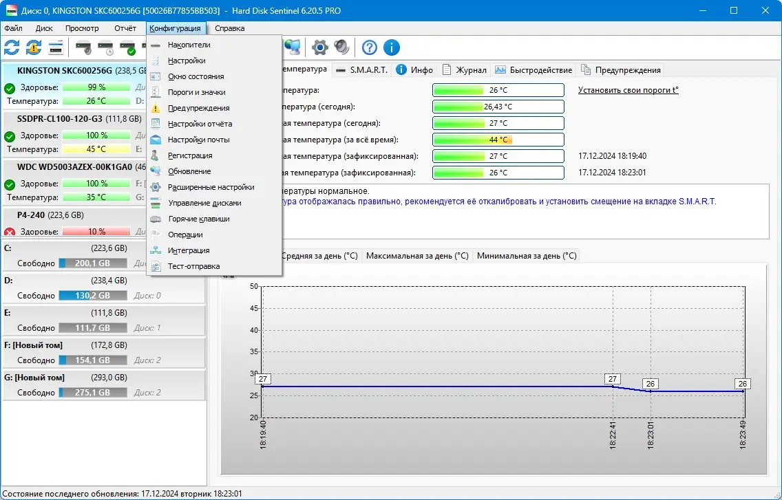 После запуска программа автоматически определяет все подключённые накопители и начинает мониторинг. В главном окне отображаются статус, температура, объём данных, переданных за время эксплуатации, и режимы передачи. Доступен подробный график изменения температуры и производительности. Через настройки можно выбрать язык интерфейса, настроить оповещения, задать действия при превышении температуры или снижении S.M.A.R.T.-показателей. Также доступна синхронизация времени и управление акустическим режимом дисков.