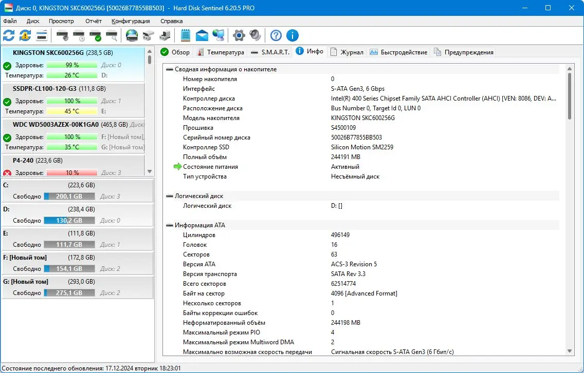 Hard Disk Sentinel предназначена для мониторинга здоровья и производительности HDD и SSD. Она поддерживает широкий спектр накопителей, подключённых через интерфейсы IDE, SATA и SCSI, и отображает детальную информацию в реальном времени. Программа использует встроенную технологию S.M.A.R.T. для предсказания отказов, измеряет скорость передачи данных и отслеживает температурный режим. Это делает её незаменимой для пользователей, которым важна сохранность информации.