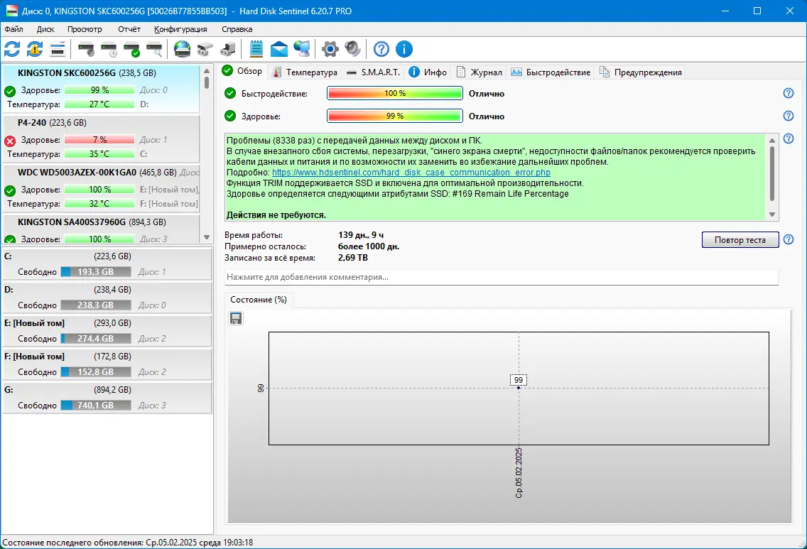 Hard Disk Sentinel предназначена для комплексного контроля за состоянием всех типов накопителей в системе, включая HDD, SSD, NVMe и внешние диски через USB-адаптеры. Утилита поддерживает широкий спектр интерфейсов, таких как IDE, SATA, SCSI и U.2, а также работает с RAID-массивами и различными контроллерами. Программа собирает данные в реальном времени, включая температуру, скорость передачи, количество ошибок и износ диска, что позволяет оценить его оставшийся срок службы. Особое внимание уделено совместимости с новыми устройствами, включая портативные NVMe-накопители и кард-ридеры формата CF express.