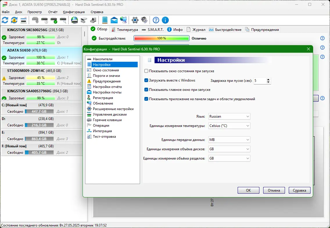 - Отображение состояния дисков в процентах на основе анализа S.M.A.R.T.-данных.