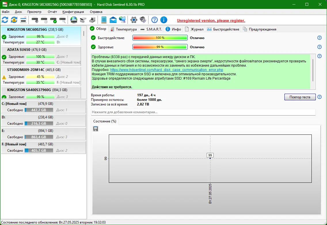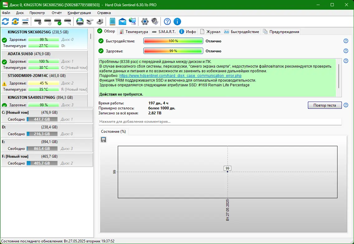 Hard Disk Sentinel — это инструмент для комплексного контроля состояния жёстких дисков и твердотельных накопителей. Программа отслеживает температуру, износ, производительность и S.M.A.R.T.-параметры, позволяя вовремя выявить признаки возможного отказа накопителя. Это помогает предотвратить потерю важных данных и минимизировать риски, связанные с поломкой оборудования.